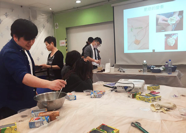 瑞豐德永集團義工先向專業導師學習制作環保肥皂的方法,隨后協助導師一起教導小朋友。