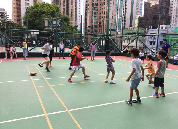 瑞豐德永義工團與小朋友互相傳接閃避盤先作熱身。