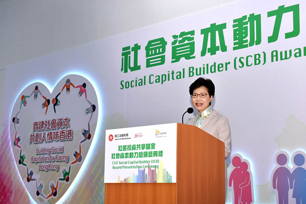 林鄭月娥女士第三度為頒獎禮擔任主禮嘉賓。她致辭時表示,社會資本的理念已逐步深入社區,愈來愈得到社會各界支持和認同。基金計劃在幫助參與者之余,也能夠令“受助者”轉化為“助人者”,延續傳承互助文化,并能提升居民彼此間的互信、對社區的歸屬感,長遠而言能夠促進社區解決困難的能力。