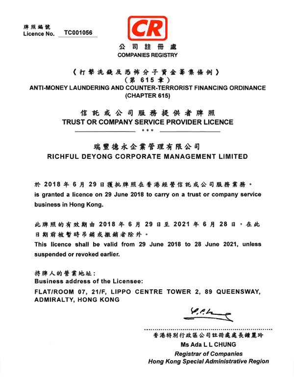 瑞豐德永 【信托或公司服務提供者牌照】 三張牌照 香港公司注冊處查冊: