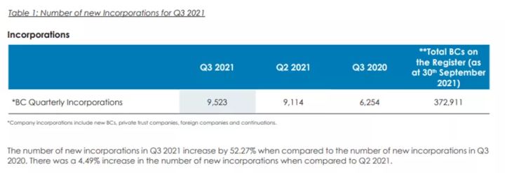 統計數據顯示,2021年第三季度BCs(商業公司)新注冊數量是9523家,環比增加409家,增幅為4.49%,同比增加2999家,增幅為52.27%。