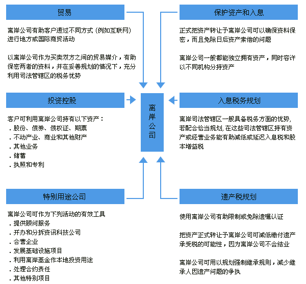 無論客戶以個人還是企業的身份均可以利用離岸公司作多種用途,其中最普遍的用途和好處包括: